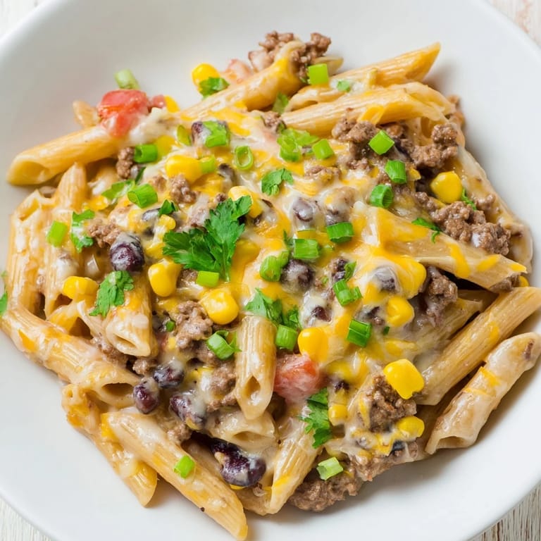 Pin It I discovered this dish one chaotic Tuesday night when my kids were starving and I had exactly twenty minutes before swim practice. The kitchen was a mess, but I had pasta, ground beef, and a taco seasoning packet hiding in the pantry, so I just threw everything into one pot and crossed my fingers. When that first steaming bowl came together—pasta tender, sauce rich and cheesy, little pockets of corn and beans throughout—my daughter actually paused mid-complaint to ask for seconds. That's when I knew I'd stumbled onto something special.