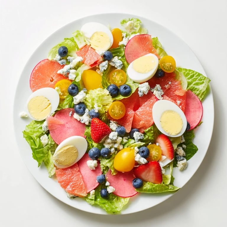I've learned that the arrangement is truly an art form. Think in terms of balance rather than perfection. Your eye wants to see color distributed across the whole platter, not all the pinks bunched together. I like to imagine I'm creating little flavor journeys—every bite has a different combination of elements. One forkful might have blueberry and grapefruit, the next has radish and egg. It keeps people engaged and interested from the first bite to the last.