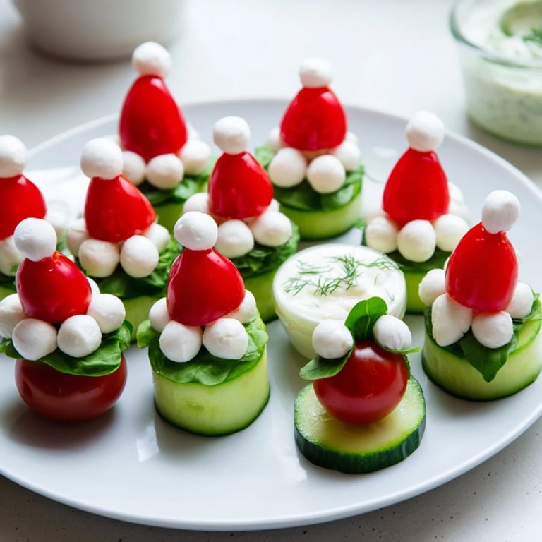 Pin It A festive and vibrant platter featuring fresh vegetables arranged as Santa hats, served with a flavorful dip—perfect for holiday gatherings and healthy snacking.