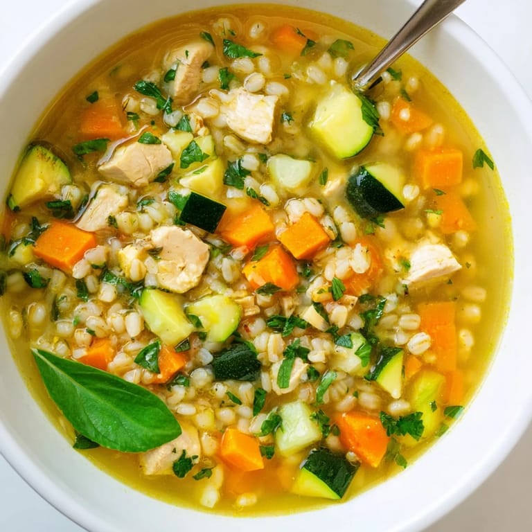 - Toss in diced zucchini and continue simmering for 10 more minutes, until barley is tender and chicken is cooked through completely.